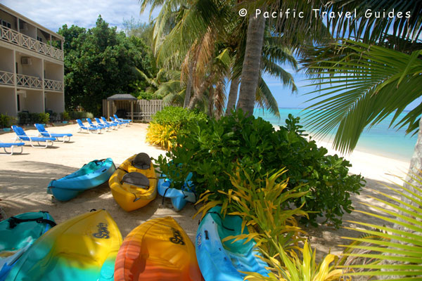 The white sand beach infront of Moana Sands stretches for miles in each direction and is backed by palm trees, although the beach is on the very southern tip and receives less sunshine than the west and east coast. The part sandy bottom lagoon has the islands best snorkelling close by (5 minutes by kayak) and both kayaks and snorkelling equipment are complimentary.