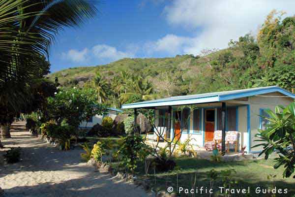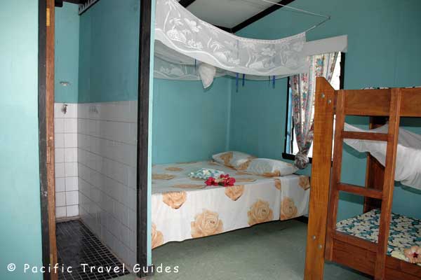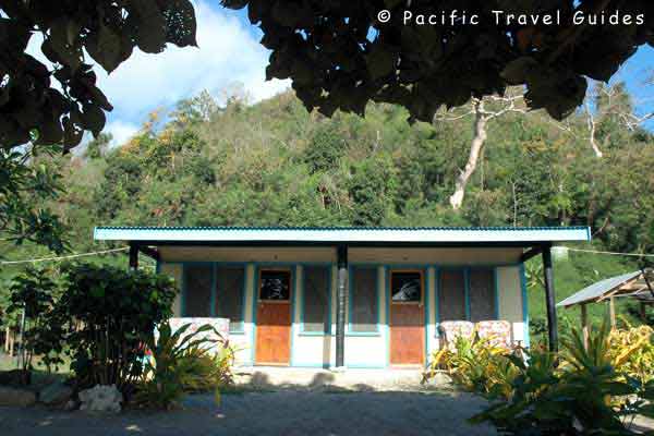 Coconut Bay offers private rooms in duplex bungalows (1 bungalow divided into two private rooms), each with a double bed, bunk bed and private but tiny en-suite bathrooms with flush toilet and cold water showers but no hand basin. The double beds are on the small side and rooms can get stuffy. There is also a 16-bed dormitory with bunk beds for single travellers. The beachfront is picturesque with white sand but the lagoon is too shallow for snorkelling or swimming. There are several mountain trails, one of which leads 20 minutes to another protected bay with good snorkelling and swimming.