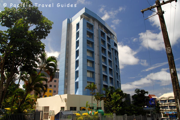 Tanoa Plaza Hotel Fiji is centrally located in the downtown Suva area close to the embassies and the business district. making it a practical base for business people. Modern rooms are located over six floors, are serviced daily and offer air-conditioning and views. The 24-hr reception faces the communal lounge and dining area where breakfast and lunch is served. Laundry facility available.