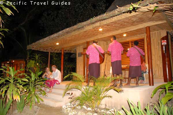 The 11 Deluxe Ocean Front bures are built in traditional Fiji style with high ceilings, decorated in traditional art, with large en-suite bathroom extending into a private courtyard with outdoor shower.