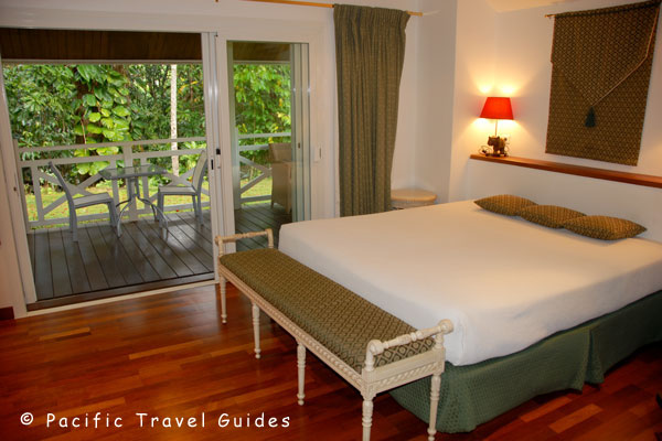 Bungalows face a small stream with private veranda, timber floors and modern styled interiors.