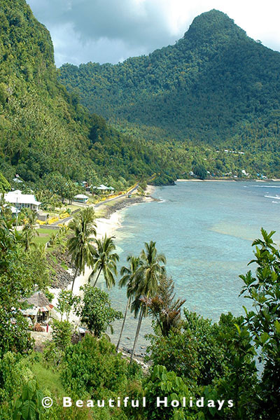 Upolu Island is volcanic in nature, with high tropical mountains rising in the interior, the highest point being Mt. Fito at 1158m. It is a long island with its capital town Apia midway along thenorth coast and the international airport about 40-minutes drive to the west. Most of the population liove along the north coast but the best beaches and most of the islanhds resorts are on the more rural south coast.