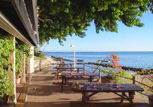 The property itself is rather cramped with limited parking but there's a lovely Italian style restaurant under a huge Fig Tree serving excellent Pizzas and overlooking the ocean (and sunsets). There's a good size pool and the newer two-storey hotel block has sanitary clean air-conditioned rooms with kitchen facilities. Bungalows are charming with thatch roofs although a little dated and are set back in the gardens.