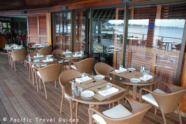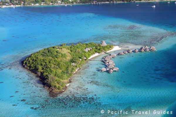 On a private island in the lagoon are the "island bungalows" located on a private island within the lagoon and accessible by a three minute boat ride from the resort beachfront. The small motu island has an impressive central restaurant serving exquisite food with each table overlooking the lagoon and the mountains of Bora. There's a picturesque but small sandy point for beach lovers and the island has steep hills with walking tracks are built high up on stilts in a wooded hillside offering great views overlooking the ocean or on the lagoon (note cobbled stone pathways and steep hills may be impractical for some guests).
