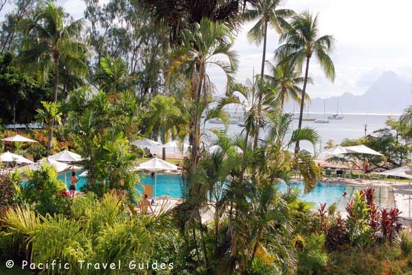 There's a large swimming pool, a reasonable beachfront with pleasant views across a bay of yachts to Moorea Island, two restaurants (one Japanese) and a sunset bar.