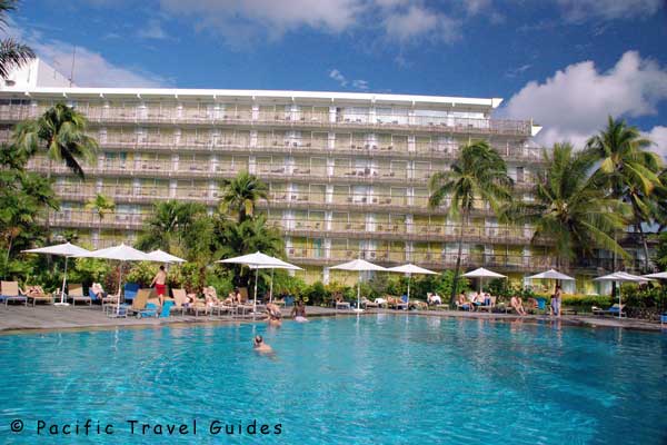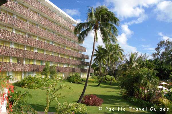 The Sofitel Tahiti Hotel offers modern comfortable rooms alongside a small beach close to the international airport. The uninspiring 60's style hotel façade with its eight storey cement building still exists but interior finishings and a mix of contemporary art and bright Polynesia colours make this a pleasant and affordable stopover.