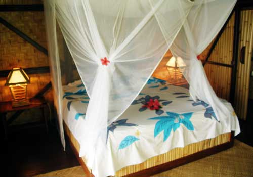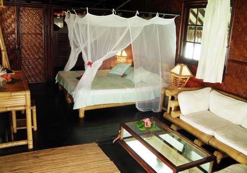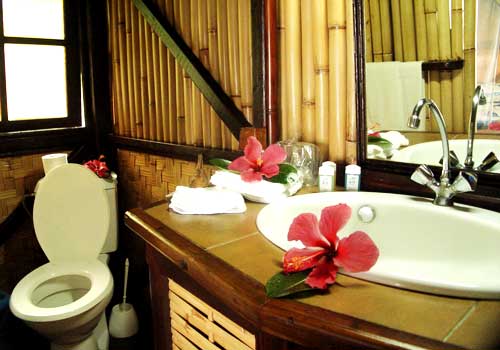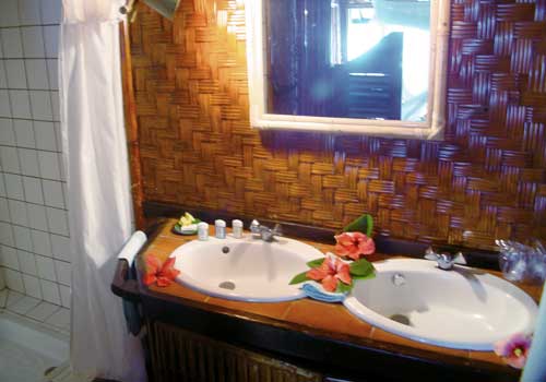 Overwater Bungalows face west and overlook the mountains of Tahaa. Each of the three bungalows offers a large open plan room with rattan furnishings and a small bathroom (low shower head) with separate but tiny toilet. There's a large wooden veranda along two sides of the bungalow giving good privacy. Each bungalow has direct access into the lagoon.