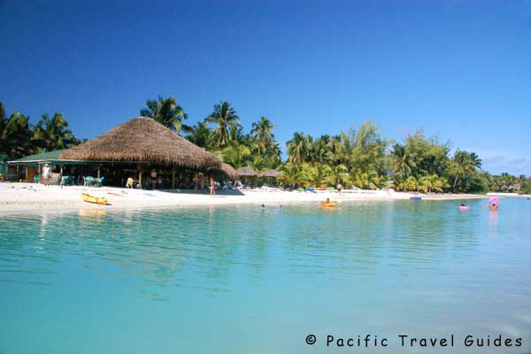 The beach is located across a sandy lane from the bungalows and stretches along Ootu Point infront of a narrow but deep water sandy bottom lagoon good for swimming (boats sometimes use the channel). Beyond the channel is a shallow lagoon which at low tide connects to Akitua Island exposing several sand bars for exploring. This lagoon isn't good for snorkelling but you can snorkel around the point in deeper water or on day cruises which stop at some great snorkelling reefs.