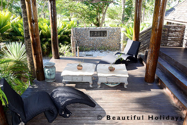 spa on beach bure deck Sonaisali has two individual family bures with 2 bedrooms and large separate lounge area. They have similar interior designs and furnishings as the beach bures