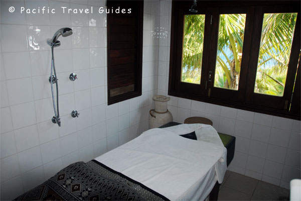 The single Honeymoon Beach Villa is a traditional style bure with high ceiling, exposed beams and traditional decorations. The open plan living space has a King size bed with a bathroom behind featuring separate toilet and two showers, one outside in an enclosed rock garden. The lounge area opens up to a bamboo screened plunge pool. There’s also a second veranda space infront of the bure overlooking the beach area and offshore islands, although this is a public pathway between the main beach and marina so has less privacy than the Honeymoon Ocean View Villas.
