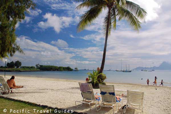 There's a large swimming pool, a reasonable beachfront with pleasant views across a bay of yachts to Moorea Island, two restaurants (one Japanese) and a sunset bar.
