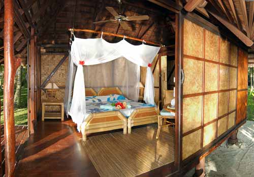 Overwater Bungalows face west and overlook the mountains of Tahaa. Each of the three bungalows offers a large open plan room with rattan furnishings and a small bathroom (low shower head) with separate but tiny toilet. There's a large wooden veranda along two sides of the bungalow giving good privacy. Each bungalow has direct access into the lagoon.