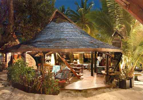 The island is covered in coconut palms and lawn and there's a lovely open-air restaurant with sand floor and wooden designs overlooking the ocean.