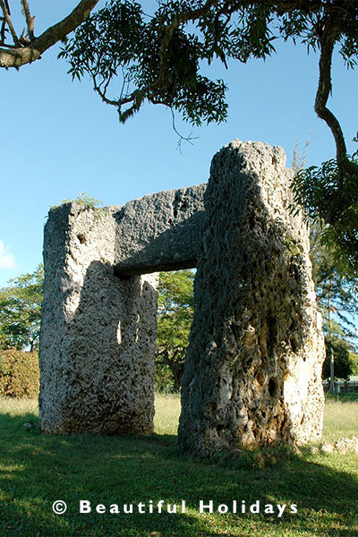 Tongatapu is a flat coral island about 30km in length with raised limestone cliffs along its southern coast. A confusing network of roads meander around the entire island with small villages and plantations strung out along the roadside but in few places are there coastal views. The eastern half of Tongatapu is less developed with miles of deserted white sandy beaches, limestone coves and deep caves along its coast. The ancient settlement of Lapaha is scattered with relics - large royal tombs (langi) shaped like a elongated pyramid line the road. The largest concentration is in the Mu'a section where you will find 28 royal tombs made of massive limestone slabs brought from the outer islands. On the northern tip of the island is the impressive trilithon of Ha'amonga 'a Maui believed to have been erected in the 13th century.