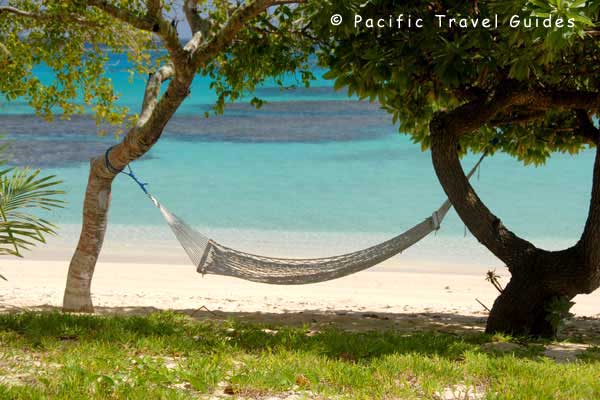 The beach at Sandy Beach Resort extends beyond the resort for a few hundred metres to a sandy point – the northern end of Foa Island – and along a meandering rocky limestone coast to the south, accessible only at low tide and with several small cove beaches making it great for exploring. The sand directly in front of the resort is deep with at least ten metres of beach remaining at high tide, backed by light scrub and coconut trees strung with hammocks. The lagoon has a sandy bottom and making it great for swimming at all tides and there’s good snorkelling a short swim from the beach.